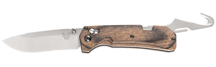 The total package for a hunting folder with the AXIS® lock, the perfect blade size and shape for just about any game cleaning chore, and a folding gut hook that's only there when you want it. Made in USA. Designer: Benchmade Mechanism: AXIS Action: Manual-opening Blade Steel: CPM-S30V (58-60 HRC) Blade Length: 3.50" (8.89cm) Blade Thickness: 0.124" (3.15mm) Open Length: 7.84" (19.91cm) Closed Length: 4.34" (11.02cm) Handle Thickness: 0.56" (14.22mm) Weight: 4.76oz. (134.94g) Features -Blade Edge: Plain -Blade Finish/Color: Satin -Blade Style/Shape: Drop-point -Clip Type: Standard -Clip Position: Tip-Up -Glass Breaker: No -Handle Material: Stabilized Wood -Lanyard Hole: No -MOLLE Compatible: No -Sheath Type: No Sheath -Use: Hunting