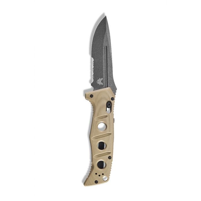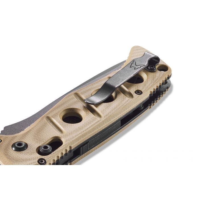 More InformationBlade EdgeSerratedBlade Finish/ColorTungsten GreyBlade SteelCPM-CruWear® (63-65)Blade Style/ShapeDrop-pointClip TypeDeep-CarryClip PositionReversible Tip-UpGlass BreakerNoHandle MaterialG10Lanyard HoleYesMOLLE CompatibleYesSheath TypeBallistics NylonUseTacticalBlade StyleSerrated Drop-PointHandle MaterialBlade Finish: Finish Tungsten Grey Blade Steel: CPM-CruWear (63-65 HRC) Handle Material: Desert Tan G10