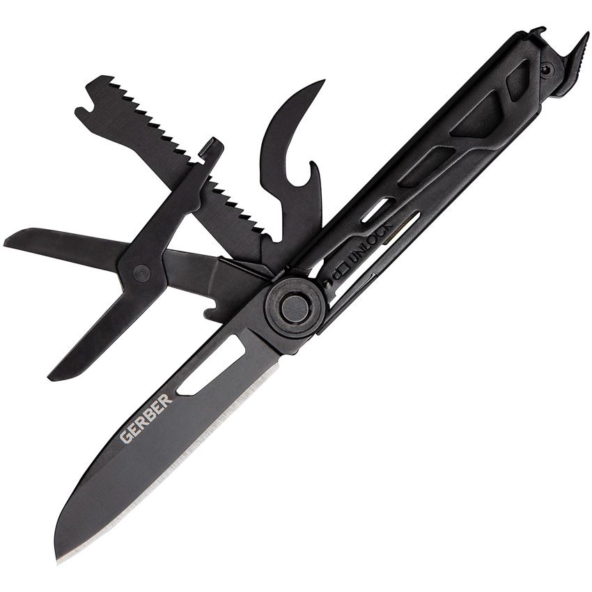 6.5" (16.51cm) overall. 3.63" (9.22cm) closed. Green aluminum handle. Tools include: Small blade l Pry bar l Bottle opener l Pocket clip l Scissors l Can opener l Saw blade. Hammer. Boxed.