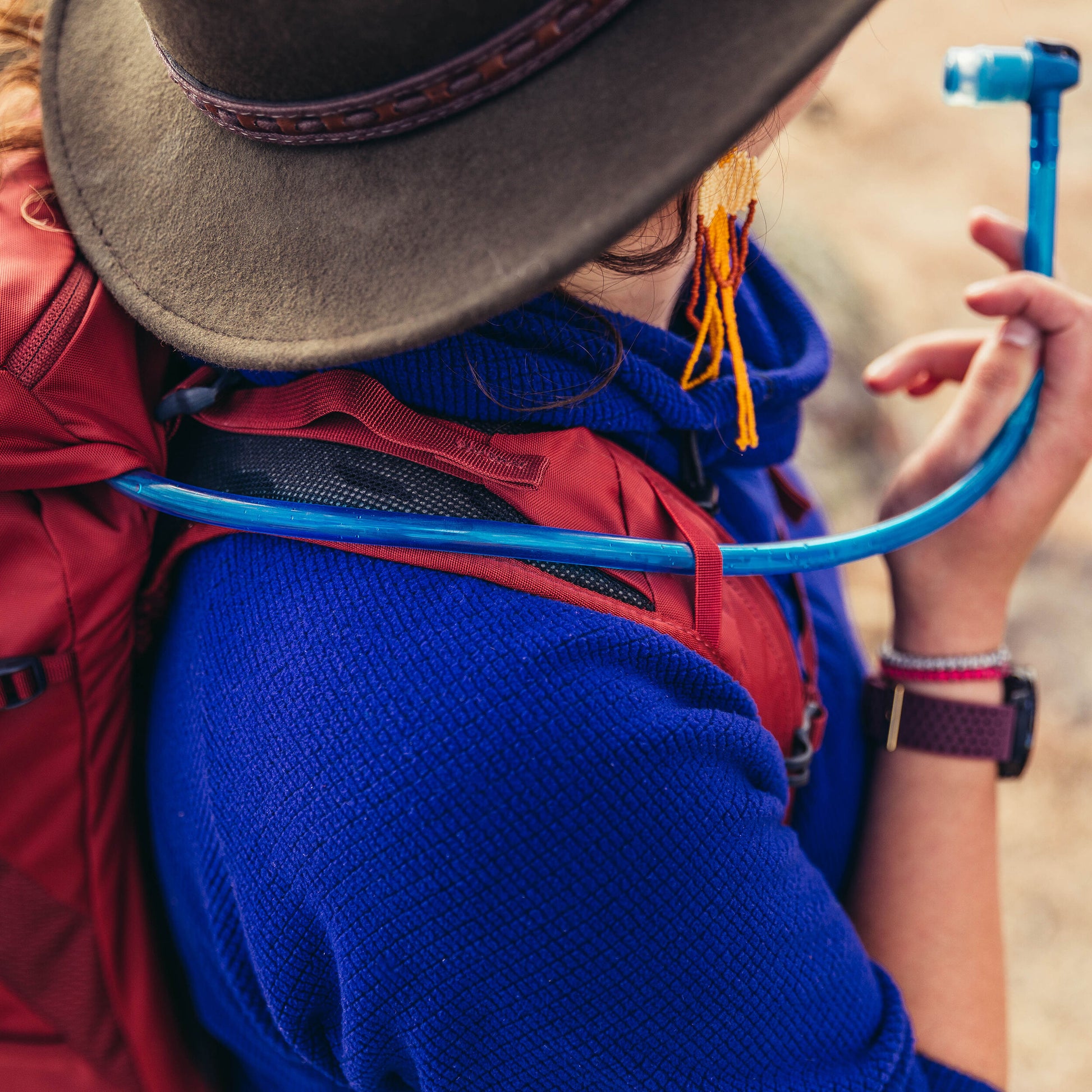 - Perforated, breathable shoulder harness with integrated hydration routing and sternum strap with integrated safety whistle