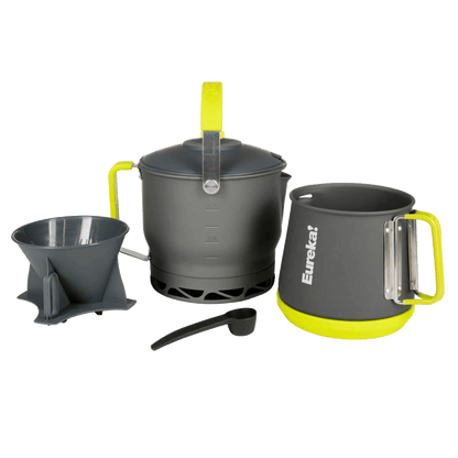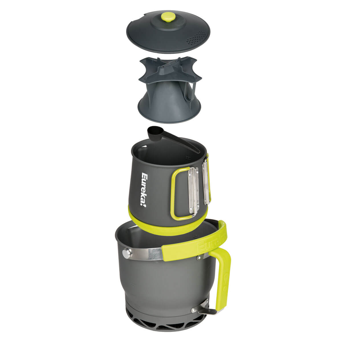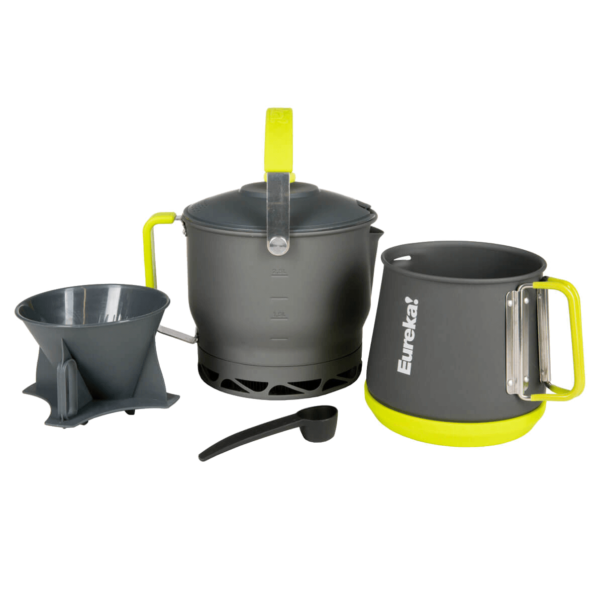 Nesting together for easy transport and storage, the Camp Cafe brews quality coffee for the whole crew quickly and cleans up in a snap. Equipped with Eureka!'s patented Flux Ring technology, the 2. 5-liter (80-ounce) boiling kettle boils water twice as fast as a standard kettle. Make quality coffee for the whole crew with the pour-over filter holder and 12-cup (60-ounce) coffee carafe.