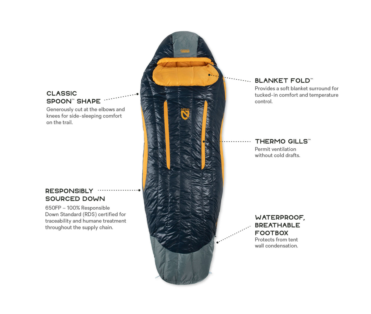 Seventy percent of people sleep on their side, yet mummy bags are not designed to accommodate this. Updated with new contours, Disco™ continues to reign as the ideal down backpacking bag for side-sleepers, offering the plushest comfort possible on the trail. The classic Spoon™ shape provides a generous cut at the elbows and knees so side sleepers can shift positions comfortably throughout the night, while still packing remarkably small. Premium 650FP hydrophobic, PFC-free, RDS Certified down ensures traceability throughout the supply chain. These 3-season backpacking bags are loaded with features, including Thermo Gills™ that help regulate temperature during the night, Blanket Fold™ that provides tucked-in comfort, and a waterproof/breathable footbox to withstand tent condensation. Left-sided zippers on Men’s and right-sided zippers on Women’s allow Disco™ to zip together for a double version of these favorite sleeping bags. Best Use Backpacking