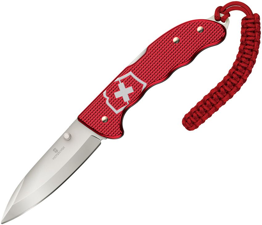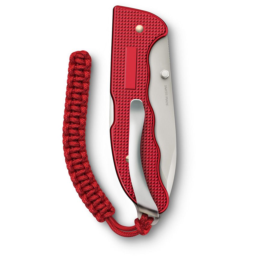 5.25" (13.34cm) closed. 4" (10.16cm) bead blast finish stainless blade. Red finger grooved Alox handle. Thumb stud. Lanyard hole. Pocket clip. Red braided paracord lanyard. Boxed.