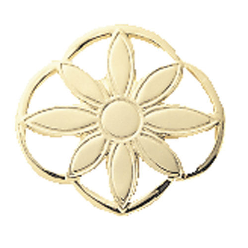 This pin, worn only by Daisy Girl Scouts, shows that a girl is a member of Girl Scouts at the Daisy Girl Scout age-level. It is worn on the Daisy Insignia Tab on the left side of the uniform, centered above the heart. Trefoil shape with daisy design. Goldtone.
