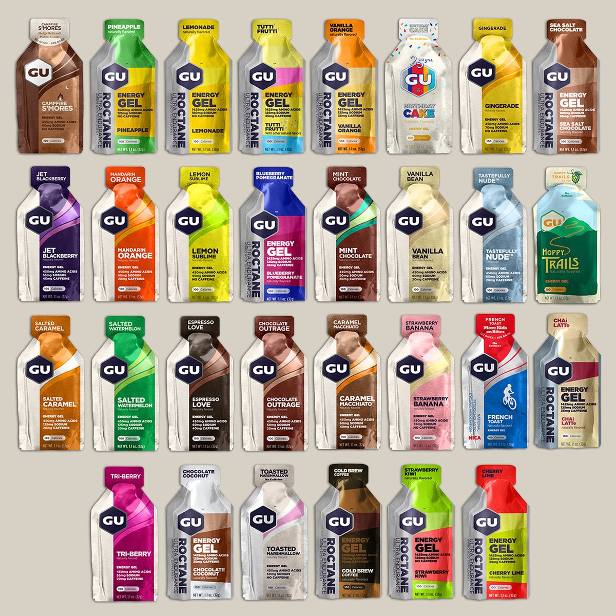 What is an Energy Gel? Energy Gels provide portable and easy-to-digest calories from carbohydrates that deliver immediate and sustained energy without the stomach distress. GU Energy Gels use a combination of simple and complex carbohydrates. Carbs become the main source of energy as our bodies transition from sedentary to an active state and exercise intensity increases. Why do I need Energy Gels? The body does have a limited carbohydrate supply, but not enough to sustain higher intensity activity for long periods of time. Thus, as you deplete your carb supply, performance suffers. You need energy in the form of carbohydrates to keep going in longer, more intense efforts. How is a ROCTANE Energy Gel different? A ROCTANE Energy Gel contains 3x the BCAAs and 2x the electrolytes compared to our original Energy Gels. They also contain the amino acids taurine (to help maintain heart contractility and improve cardiac output during long exercise sessions) and beta-alanine (to help promote formation of the intramuscular buffer carnosine, which can prevent cell damage). ROCTANE Energy Gels deliver the same combination of carbohydrates and same number of calories. ROCTANE Energy Gels are a key tool for high-intensity or prolonged activity when nutrient depletion and muscle damage occurs rapidly. Why are Energy Gels made with two types of carbohydrates? Carbohydrates are efficient energy, and we use a blend of carbs to deliver more energy into the bloodstream as efficiently as possible. Our system of dual-source carbohydrates provides an “express lane” for each carb to deliver energy to your body much quicker than a single source of carbs, which helps you avoid “the bonk” during training and racing. When should I take an Energy Gel? We pack 100 calories into our Energy Gels because, in general, the body can digest roughly 120-240 calories per hour during exercise. If you tried to eat more, the body would divert blood from your muscles back to the gut to handle the excess food/calories. If your metabolism is slower, then one Energy Gel every 45 minutes works just fine. If you have a faster metabolism, try ingesting one Energy Gel every 30 minutes and see if it agrees with your digestion system. We always recommend practicing your nutrition plan to determine what works best for you. How do I eat an Energy Gel? Do I have to eat the entire Energy Gel at one time? Rip open the top and squeeze the entire packet into your mouth—don’t save half of it for later. It’s also completely appropriate to “sip” the Energy Gel over the course of a couple minutes rather than slamming the it all at once. Our Energy Gels were designed to be taken in one shot to provide you with maximum benefits. Can I use an Energy Gel for a strength workout or yoga? Sure! While GU Energy Gels were designed for endurance sports, they can be used anytime you need energy to fuel a workout, regardless of what type. Exercise is either aerobic or anaerobic, but you’re burning calories either way. How does the caffeine in GU Energy Gels help me? GU Energy Gels and ROCTANE Energy Gels come in both caffeinated and non-caffeinated flavors. Caffeine is more than just a morning pick-me-up. Strategically adding caffeine to your nutrition plan before and during exercise can help keep your mind sharp, decrease perceived effort, boost your endurance, and delay fatigue. Click here to read more about caffeine for endurance athletes. Do GU Energy Gels freeze? Yes, but well below zero. They will thicken in cold weather, so keep your Energy Gels close to your body to keep it warm. How long does an Energy Gel take to work? Right away! The fructose converts quickly into an energy molecule that your muscles can tap within minutes. The maltodextrin, which makes up 70-80% of the carbohydrate blend (depending on flavor), takes several minutes longer. Because of this delay, your muscles enjoy a steady stream of energy instead of one gigantic sugar rush and a corresponding crash. Are Energy Gels safe for children? Yes, if they’re playing sports, on a hike, or active, GU Energy Gels can help kids just as much as they help you. You may want to keep them away from flavors that contain caffeine, though. Are GU Energy Gels Kosher, vegan-friendly and gluten-free? GU Energy Gels and ROCTANE Energy Gels are both kosher certified, gluten-free and vegan-friendly. When should I eat ROCTANE Energy Gels? ROCTANE Energy Gels were designed to help provide nutritional support for prolonged and/or more intense exercise. Therefore, you will find ROCTANE Energy Gels especially beneficial during exercise which requires extra recovery time and/or where you need help with preventing fatigue, increasing concentration, focus, and decreasing perceived effort. When you are going big or the workout is going to require more of you because of the weather, terrain, environment, intensity, etc.– use ROCTANE Energy Gels. During a more typical workout – use original GU Energy Gels. How can I use ROCTANE Energy Gels with ROCTANE Energy Drink Mix? If you already use ROCTANE Energy Gels, you can substitute two-and-a-half ROCTANE Energy Gels for one serving of ROCTANE Energy Drink Mix. Remember, the body can typically handle around 120-240 calories per hour, so keep this in mind when combining the two. This will help tailor energy intake to your needs and provide the beneficial ingredients found in both the gel and drink. While many ingredients are similar in the two products (carbohydrates, BCAAs, and caffeine) each has unique ingredients which may also help improve performance. Therefore, using both products will help provide every nutritional advantage possible to athletes who demand the best from themselves and their nutrition. Why does ROCTANE Energy Gel have the same number of calories as original GU Energy Gel? You find 100 calories of carbohydrates in both ROCTANE Energy Gel and GU Energy Gel because there’s no reason to add more. The gut can only absorb so many 