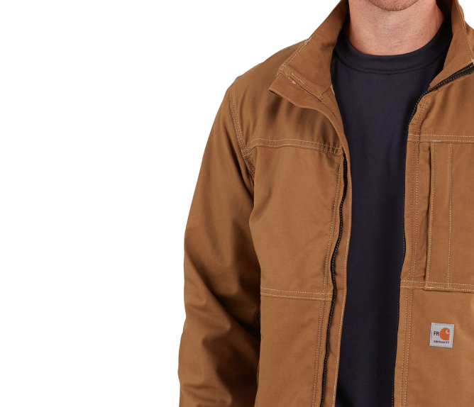 Designed with insights from the Carhartt Crew, this men's jacket punches above its weight class. When your job requires exposure to dangerous arcs and flames, protect yourself with this men's flame-resistant jacket. It's made of lightweight, water-resistant fabric that gives you the warmth and durability of sandstone duck without the bulk. Stretch panels on the back, elbows, and sides let you maneuver into tight spots.