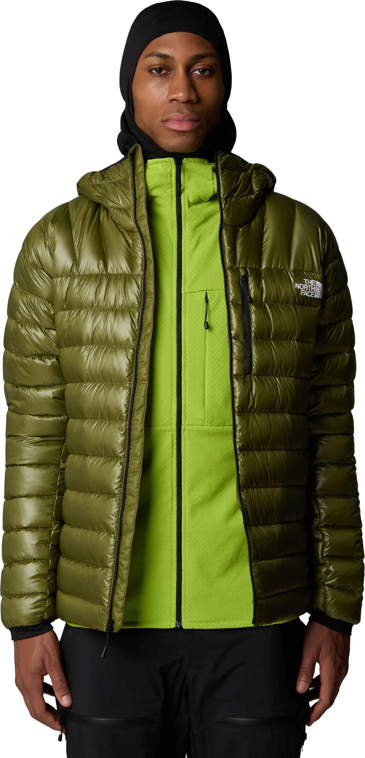 • Attached, adjustable, climbing-helmet-compatible hood with a pre-tensioned elastic opening and a cinch-cord with a cord lock on back