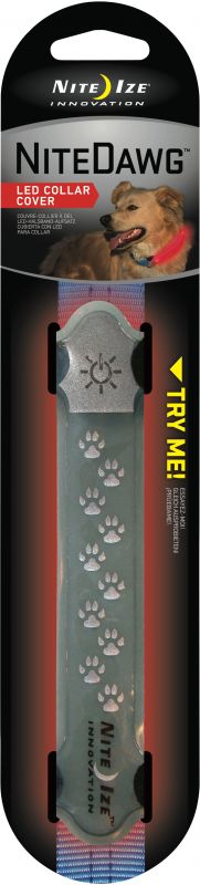 The Nite Dawg LED collar cover is the answer to every night-loving dog owner's problem: losing sight of their best buddy after sundown. Durable, weather resistant and lightweight, this super low-profile flexible LED illuminated strip fits comfortably over almost any dog's collar and closes securely with two micro hook-and-loop tabs. Its bright, light-transmitting polymer core is illuminated by a super efficient red LED bulb with two mode settings - flash and steady glow. Visible up to 1000 feet in the dark, and powered by a long-life, easily replaceable battery (included).