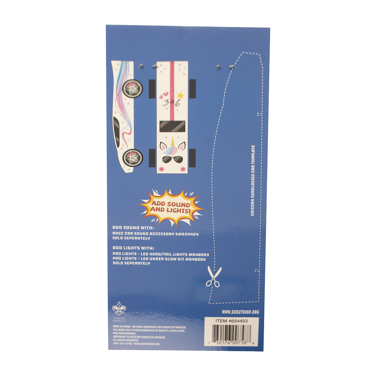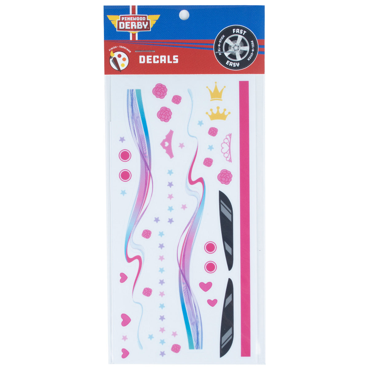 This race car decal accessory kit comes with two sheets - a main decal sheet and an accessory sheet. The decals include a unicorn face wearing sunglasses, numbers, hearts, a crown, stars, wheel rims and other sticker shapes! This kit even comes with a car template printed on the back packaging panel to assist with cutting your Pinewood Derby car to exact shape.