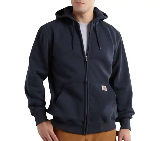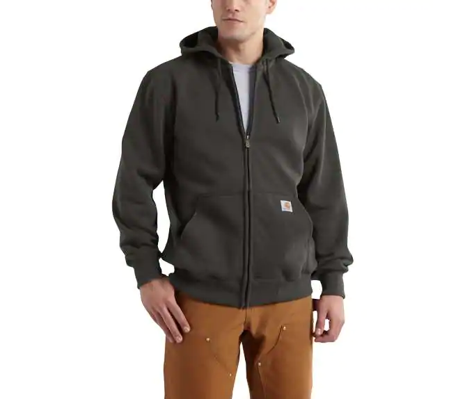Men's heavyweight, water-repellent sweatshirt for outdoor work. Don't let a little wet weather slow you down. This men's zip-hoodie gives you the familiar comfort of a favorite sweatshirt with the added benefit of keeping you dry in light rain. There's a hidden security pocket inside one of the two handwarmer pockets in the front.