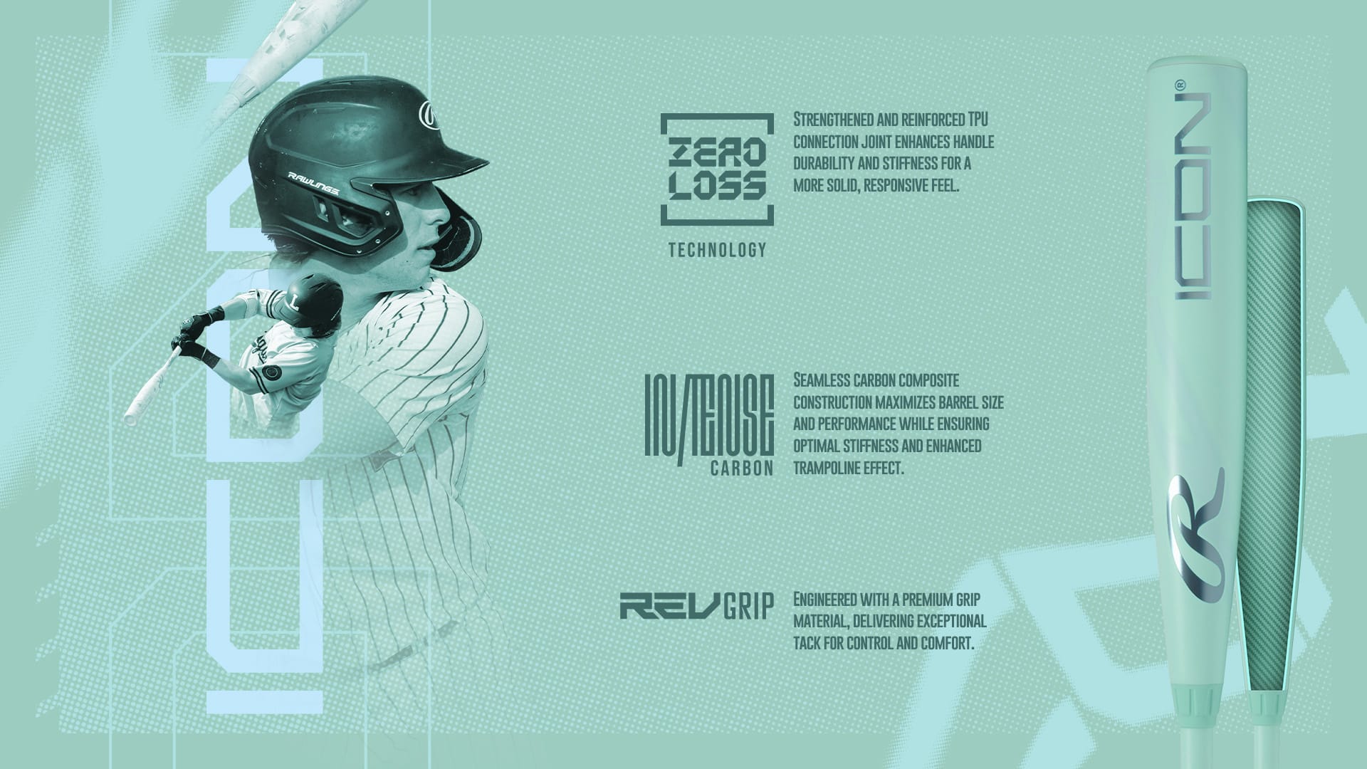 - Step into the box with bold confidence and next-gen performance with the 2026 Rawlings Icon USSSA bat -- now redesigned in a fresh new cool mint colorway that brings a clean, modern edge to our flagship USSSA bat. Built with In/Tense Carbon Composite material, this seamless barrel delivers explosive energy transfer, massive trampoline effect, and precision-balanced stiffness across its sweet spot. The tuned swing weight offers just enough end-load for extra power without slowing down your hands, while the Zero Loss Technology connection stiffens the handle for a powerful, responsive feel. Additionally, its Rev Grip ensures premium comfort and control on every swing. The Rawlings Icon USSSA bat continues to set the standard for elite baseball bats, but now it offers a new look as sharp as its performance.
