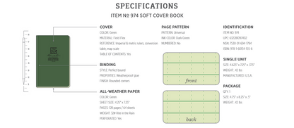 COLOR: Green SHEET SIZE: 4.25" x 7.25" PAGES: 128 pages / 64 sheets WEIGHT: 32# Rite in the Rain PERFORATED: Yes