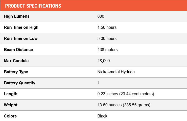- High for a far-reaching beam with maximum illumination: 800 lumens; 438m beam; runs 1.5 hours