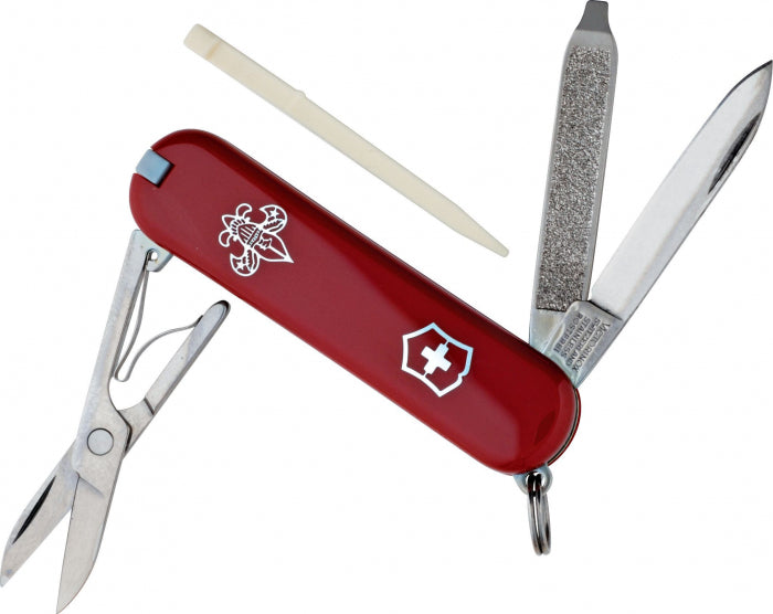 With a century of Swiss Army craftsmanship behind the design, this handy knife comes with a 2.25" stainless steel blade, along with manicure blades, scissors, tweezers, a key ring for easy carrying, and a toothpick.The handle features the BSA logo in the handle, making this a perfect gift!