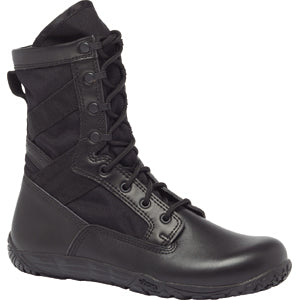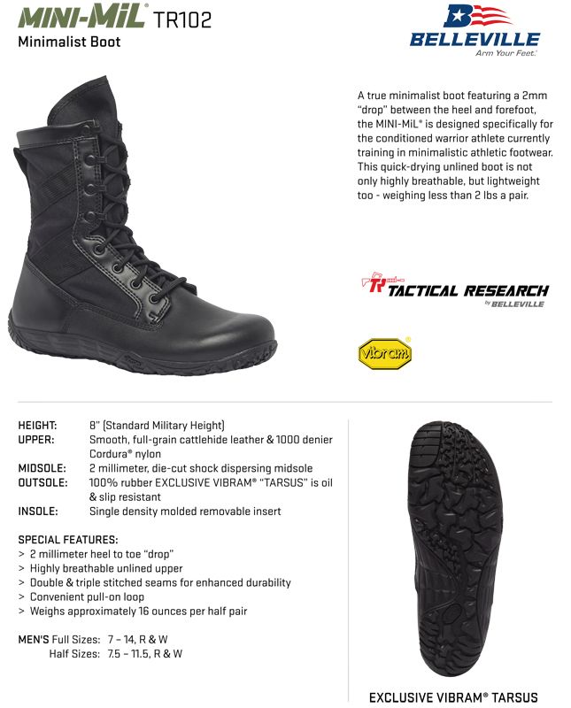 The Tactical Research TR102 MiniMil Ultra Light Black Boot is the first minimalist boot to be released on the military boot market. Based on the same tenets of the VIBRAM Five Fingers shoe, the MiniMil features a 5mm heel drop and a thin midsole to allow you feel the terrain you're walking on. As a training boot, the MiniMil will modify way you walk by training your feet to land flat footed on the ground instead of heel first like traditional footwear. This boot features a hot weather design with an unlined leather and nylon upper. As a minimalist boot, it still provides adequate protection from the elements with a padded achilles heel support and abrasion resistant nylon Cordura and leather. The TR102 is the ultimate lightweight training boot and is also ideal for light duty or garrison.