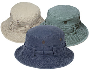The original garment washed cotton adventure hat. Belted loop band and metal mesh vents. COLOR: Assorted: 4 each: Hunter, Khaki, Navy. SIZES: Assorted: 1S, 4M, 5L, 2XL. PACKED: One dozen.