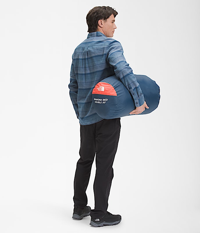 Synthetic insulation maintains warmth even in damp conditions. - Whether you prefer to sleep on your back, front, or side, the Wawona Bed Double Sleeping Bag delivers comfort and warmth using fully recycled fabrics. The roomy, rectangular design is large enough to fit two sleepers without feeling crowded. Plus, it has a temperature rating of 20 degrees, helping you stay warm in cold conditions.